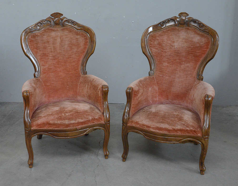 Coppia di poltrone con struttura mossa in noce intagliato e imbottitura rivestita in velluto color salmone. Fine secolo XIX (difetti)