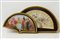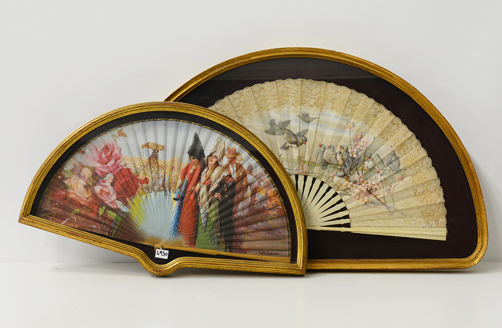 Lotto di due ventagli, uno con stecche in osso e pagina in seta e pizzo dipinta con passerotti, l’altro con stecche in legno dipinto e pagina stampata. Misure differenti, entrambi firmati, in teca (lievi difetti)