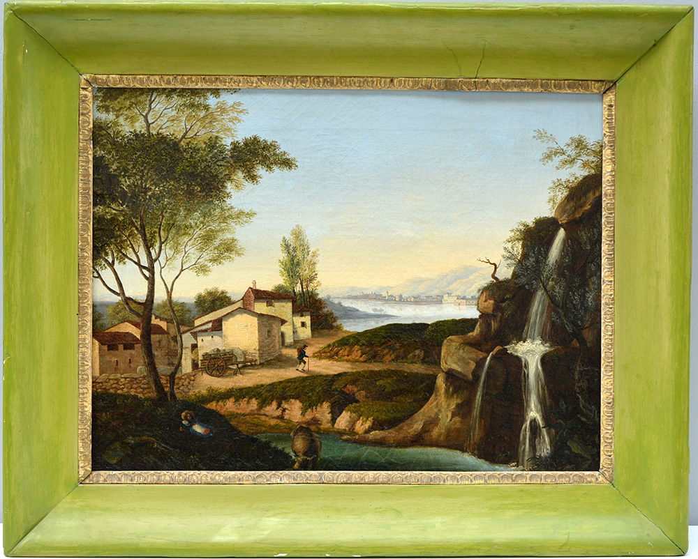 Lotto 1784 | Ignoto "Paesaggio con cascata e lago sullo sfondo" olio su tela (cm 45x60) In...