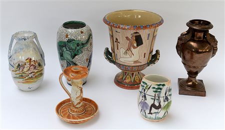 Lotto composto da cinque vasi e un candeliere di manifatture diverse tra le quali: Spica, Albisola; Mengaroni, Pesaro; Duruta. (difetti)