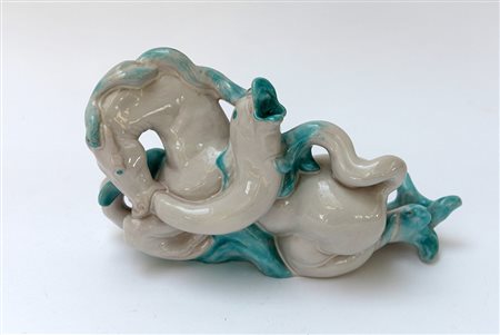 Zaccagnini "Lotta tra animali fantastici"Ceramica smalta in bianco e celeste...