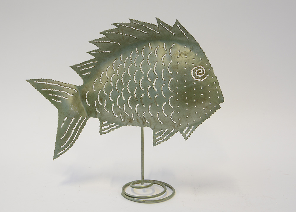 Candeliere in ferro dipinto verde con paralume a forma di pesce (h cm 38) (difetti)