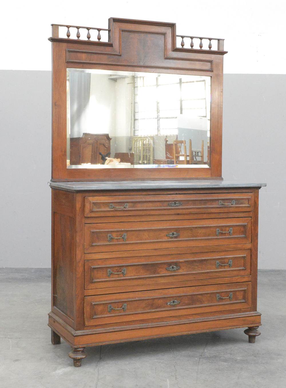 Cassettone a quattro cassetti con piano in marmo, alzata a specchio con...