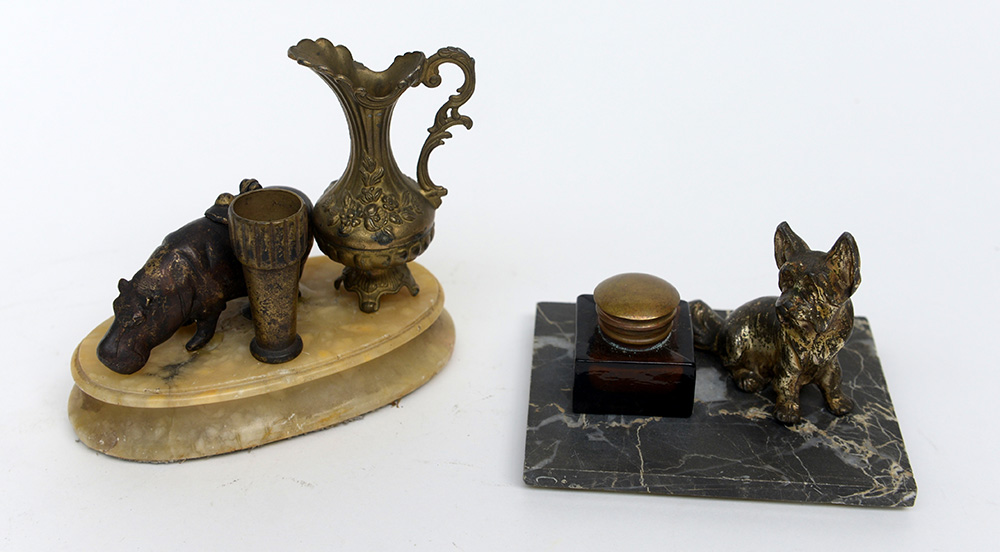 Lotto composto da due calamai in metallo dorato decorati ad animali, basi in marmo e alabastro. Secolo XX (difetti)