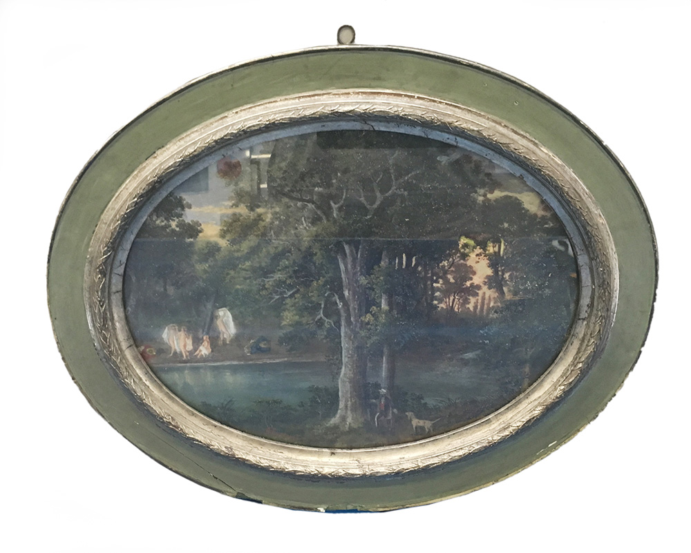 “Paesaggio fluviale con bagnanti” tecnica mista su cartoncino ovale (cm 32x42) firmato in basso a sinistra, in cornice (difetti)