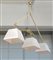 Lampadario da biliardo a tre luci con struttura in ottone, tiranti rivestiti in corda e paralumi in tessuto a plisset (difetti)