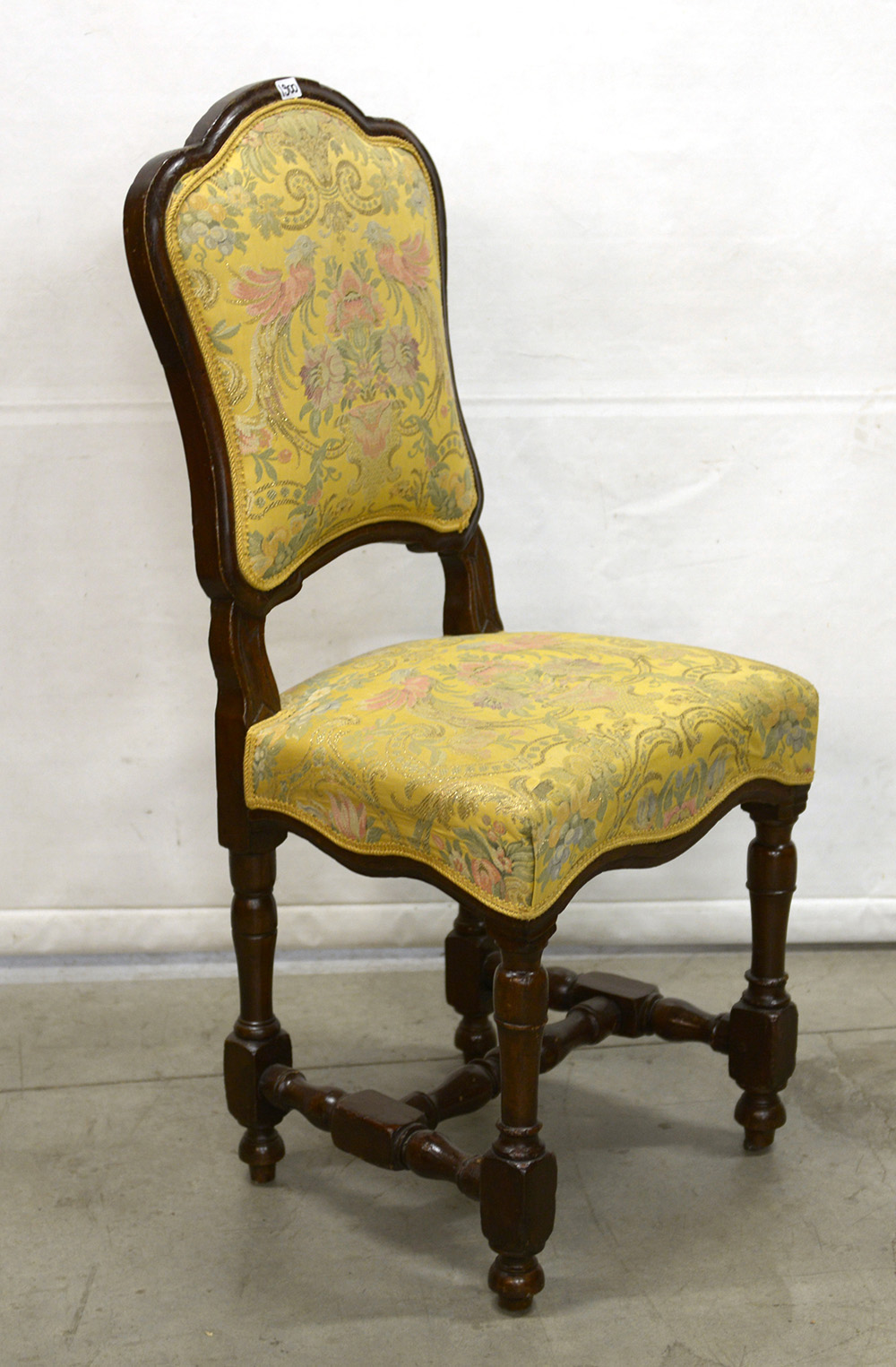 Sedia in noce con schienale sagomato, quattro gambe e traversa torniti a rocchetto. Secolo XVIII (difetti)