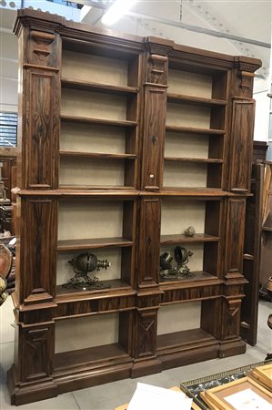 Mobile libreria con montanti radicati, ripiani a giorno e nove piccole ante sui montanti decorate con sagomette in rilievo (cm 224x290x40) (difetti)