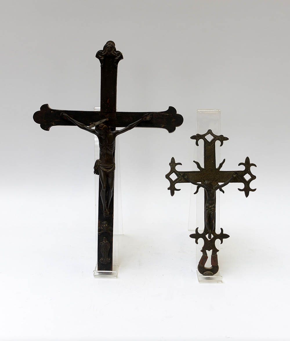 Lotto composto da due antiche sculture in bronzo raffiguranti Cristo crocifisso (restauri)