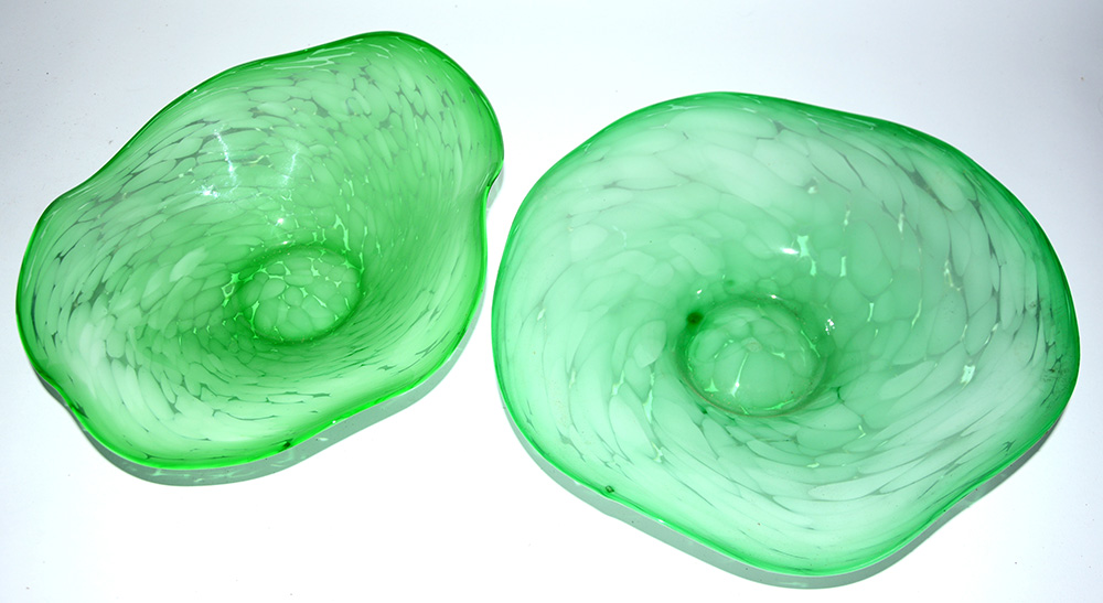 Lotto composto da due centrotavola a bordo sagomato in vetro policromo verde (d max cm 37)