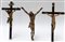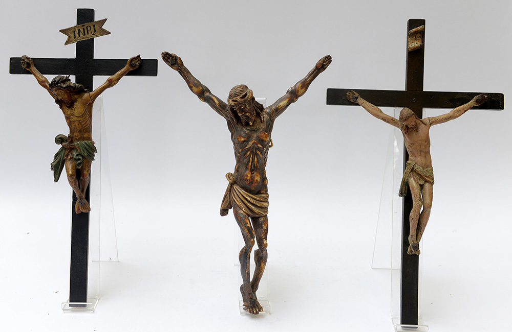 Arte del secolo XVIII / XIX. Tre sculture lignee raffiguranti Cristo crocifisso, di cui due con croci (difetti)