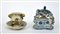 Manifattura del secolo XVII / XVIII. Lotto composto da un vasetto decorato in policromia e una saliera in maiolica decorata nei toni del blu (difetti e mancanze)