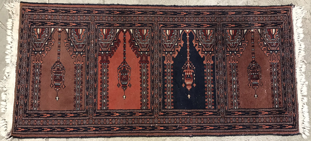 Disegno a preghiera nei toni del blu , rosso e bianco decorato con quattro medaglioni cuspidati (lievi difetti) (cm 124x70)