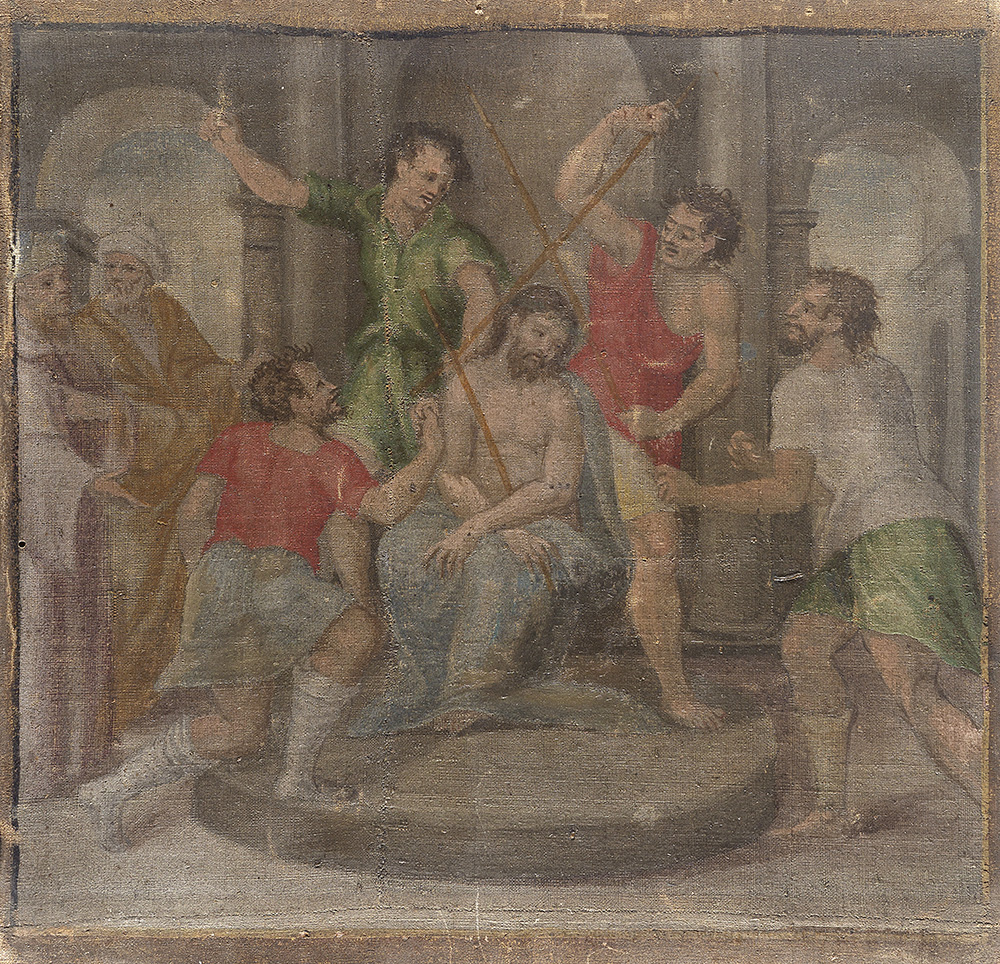 Ignoto ''Fustigazione'' olio su tela (cm 28x29) In cornice del secolo XVII in legno e pastiglia dorata (difetti e mancanze)