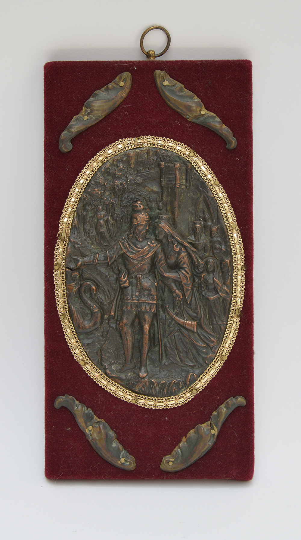 Pannello con placca ovale in rame sbalzato raffigurante una scena storica e decorato a fregi in metallo di epoca posteriore