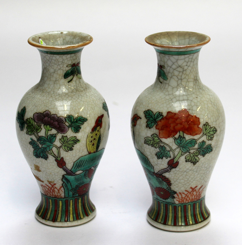 Coppia di vasetti, Famiglia Verde, fondo craquelè decorati con uccelli, marchio apocrifo alla base (h. cm 14,5) (lievi difetti)