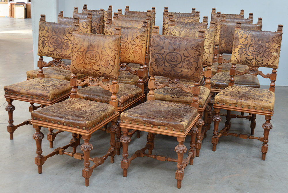 Gruppo di diciotto sedie in legno ricoperte in cuoio impresso a volute e cifre sullo schienale. Inizio sec.XX (difetti)