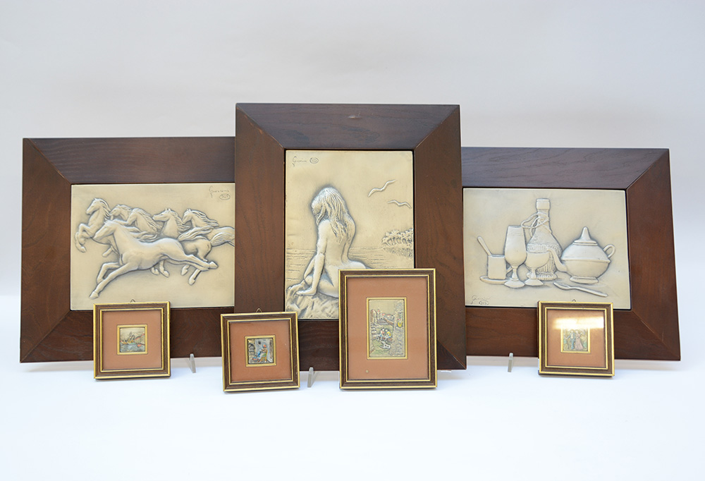 Lotto composto da sette riproduzioni in lamina d'argento di misure e soggetti diversi. In cornici