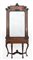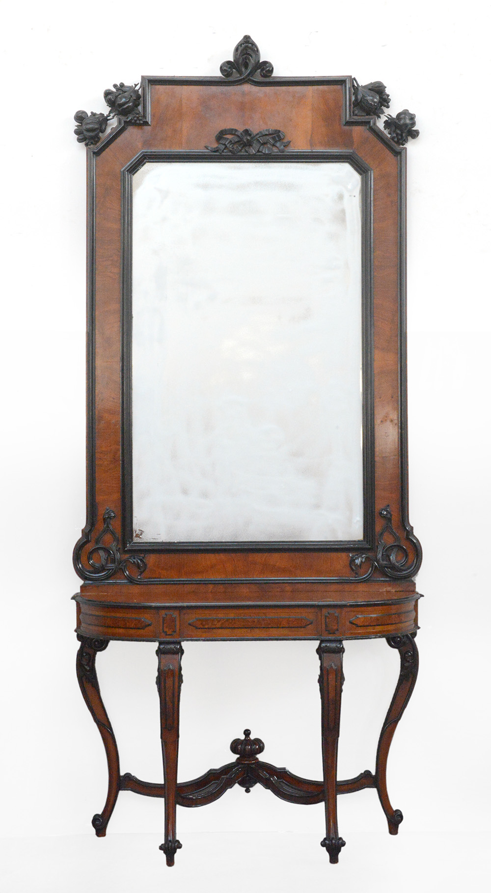 Consolle da ingresso con gambe mosse, filettature e intagliati a volute. Sormontata da grande specchiera con profili ebanizzati, culminante con frutti e foglie scolpiti. Inizio secolo XX (cm 144x330x50 circa) (difetti)
