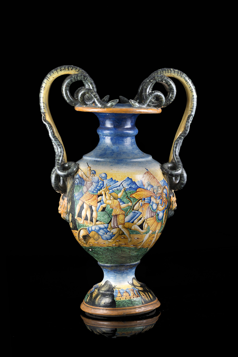Manifattura del Centro Italia, fine secolo XIX. Vaso biansato in ceramica interamente decorato sul corpo a scene mitologiche. Anse a serpenti avviluppati (h. cm 58) (mancanze e restauri)