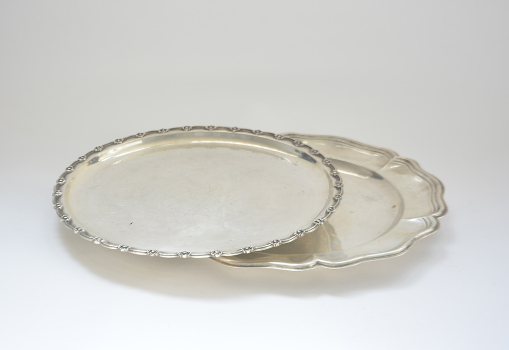 Lotto di due vassoi tondi in argento uno con bordo sagomato e cordonato, l'altro con bordo cesellato a fiorellini (gr 1600 ca.) (difetti)