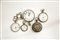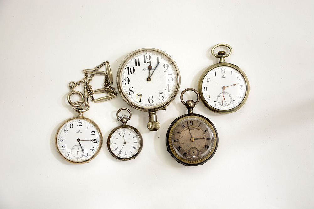 Lotto composto da cinque orologi da tasca in metallo e argento, di diverse dimensioni e decori (difetti)
