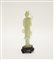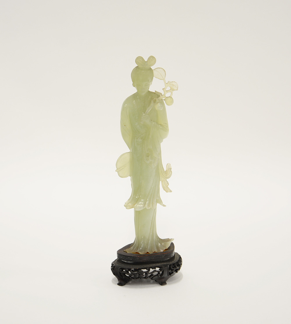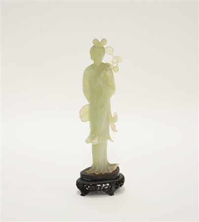 Dama dalle lunghe vesti con ramo di frutti, in pietra dura verde, base in legno (difetti)