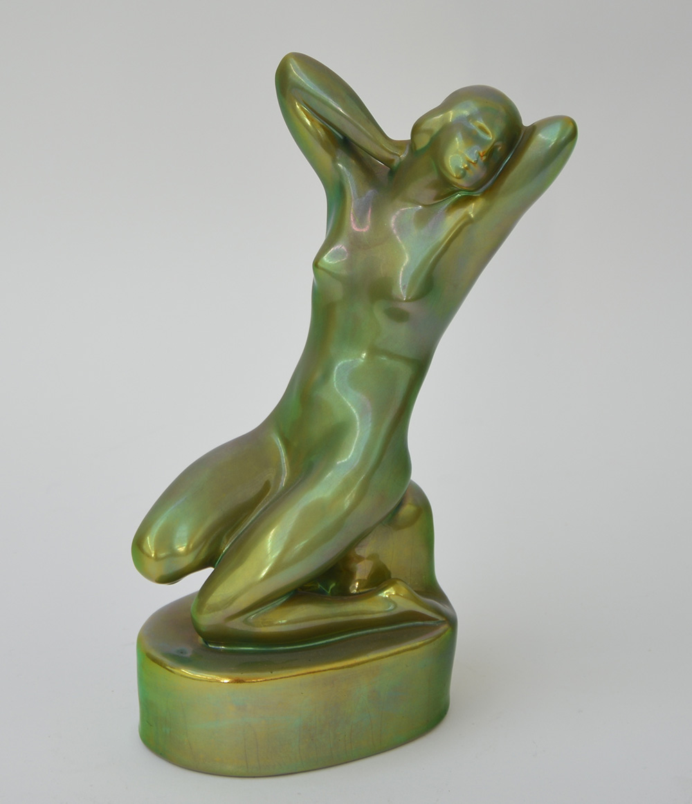 Scultura in ceramica smaltata in verde a lustro metallico. Produzione Zsonlay, Ungheria, anni '30. (lievi difetti)