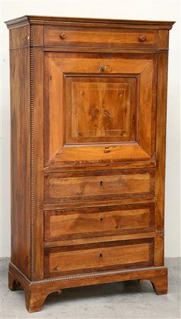 Secretaire lastronato in noce, radica e piuma di noce e filettato in legno chiaro. Quattro cassetti e anta ribaltabile celante cinque cassettini e vano, profili cordonati, secolo XIX (cm 88x158x45)(difetti)