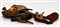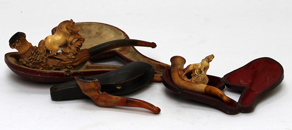 Lotto composto da tre pipe in schiuma scolpite a cavalli e zoccolo. Bocchini in ambra. Secolo XIX, in custodie (difetti)