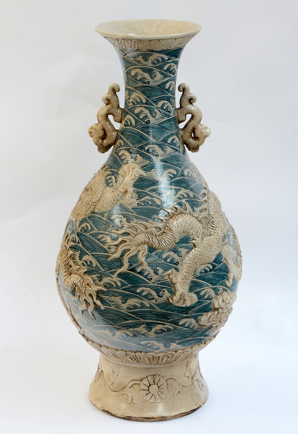 Vaso biansato in ceramica con decoro di draghi in rilievo su onde in tempesta...