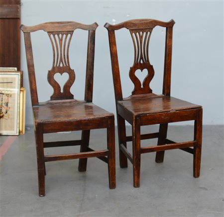 Coppia di sedie in rovere con cartella traforata e decorata a cuore. Inghilterra, inizio secolo XIX