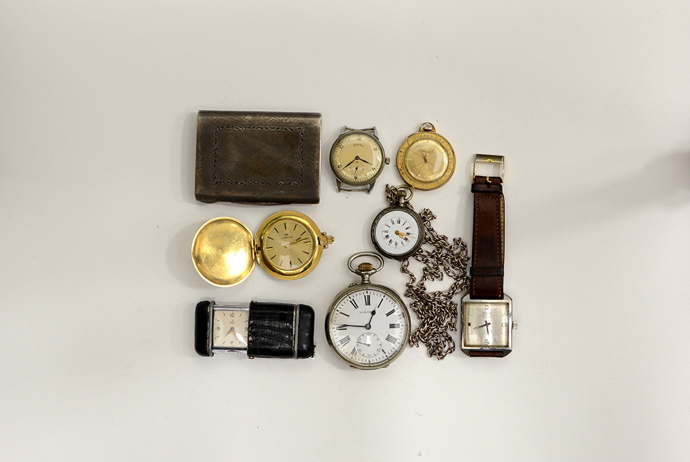 Lotto composto da un portacipria in argento con specchio interno, due orologi da polso (di cui uno senza cinturino, quattro da tasca e uno da viaggio (difetti)