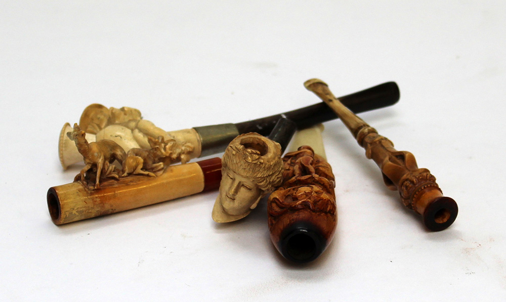 Lotto composto da cinque pipe in schiuma scolpita, secolo XIX (difetti)