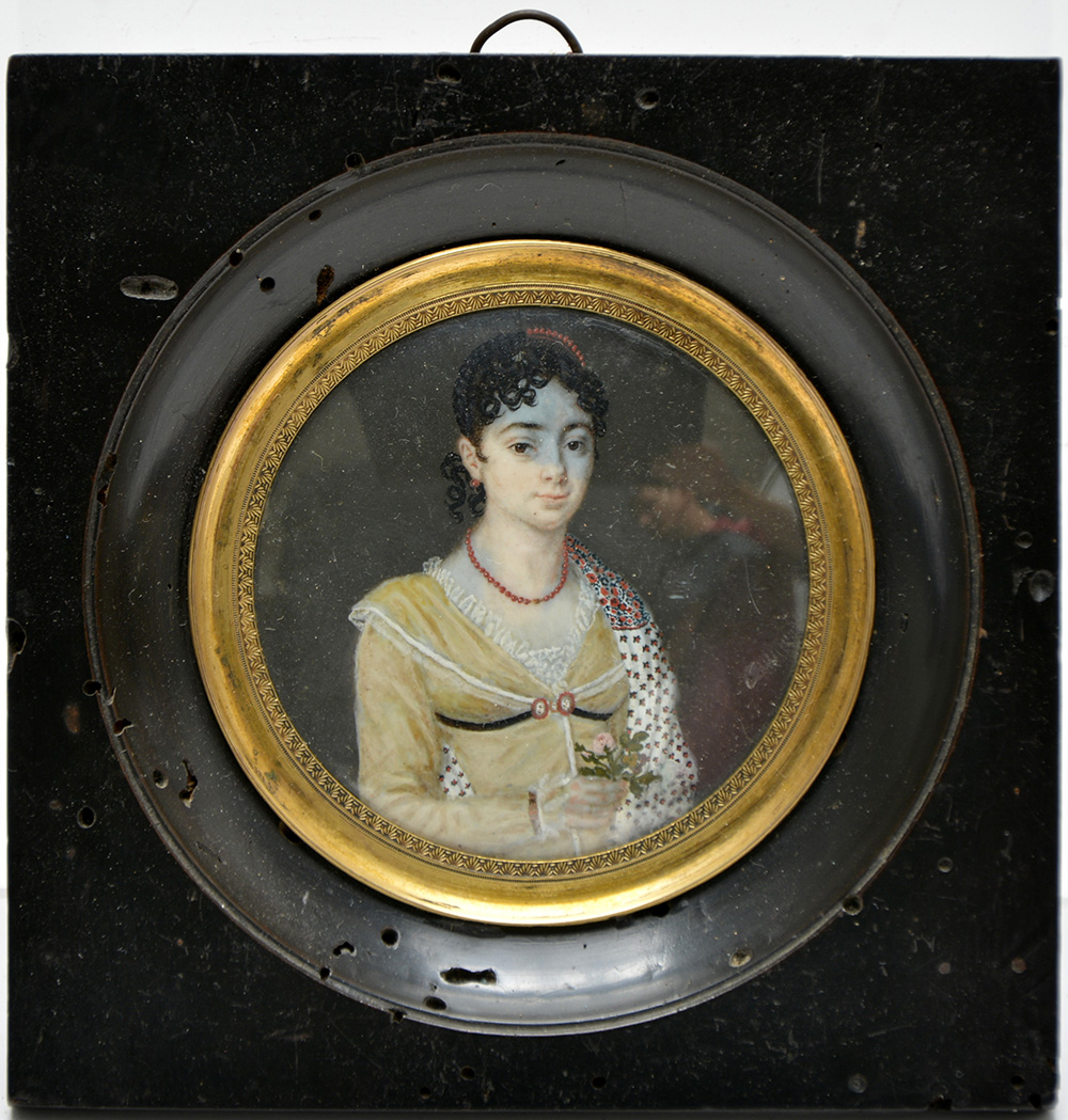 Scuola del secolo XIX "Gentildonna" miniatura su avorio (d. cm 6,5) In cornice (difetti)