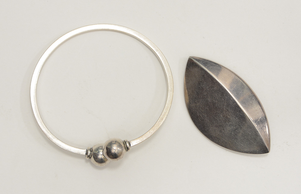 Spilla e bracciale rigido a contrarié rifinito con due boule, complessivi g.48,59