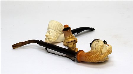 Lotto composto da tre pipe in schiuma scolpite a figure e artigli (difetti)