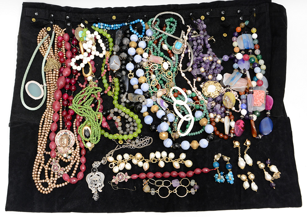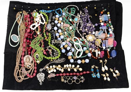 Lotto composto da diciotto collane, cinque bracciali, quattro paia di orecchini e bigiotteria varia, g 2530.