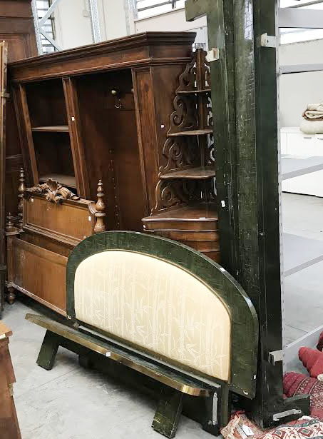 Letto in legno laccato verde con mensoline laterali e profili ottonati (difetti)