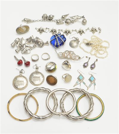 Lotto in argento 925/1000 e metallo argentato composto da due bracciali rigidi firmati Ferrè, tre bracciali rigidi diversi, tre bracciali con charms, una collana in perle di fiume, due gemelli e un pendente con paste vitree, sette anelli con gemme varie di cui uno firmato ANACONDA, quattro paia di orecchini etnici con gemme varie e un orecchino singolo (difetti)
