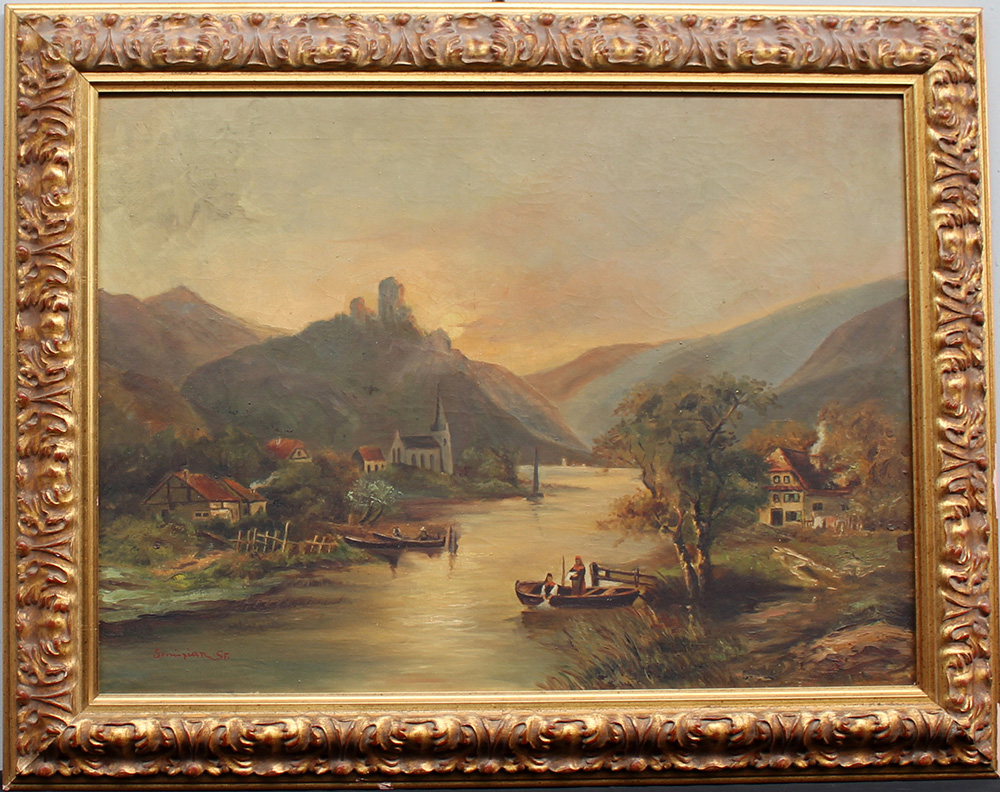 "Paesaggio lacustre con imbarcazioni e figure" olio su tela (cm 54x74) firmato in basso a sinistra, in cornice