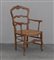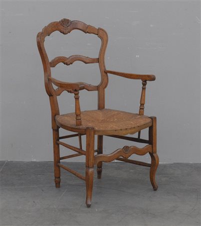 Poltrona con schienale sagomato intagliato a valva di conchiglia. Gambe mosse. Seduta incannucciata (difetti)