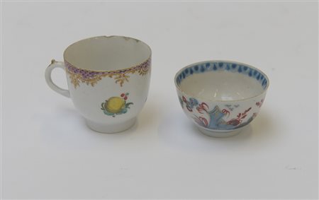 Manifattura Cozzi, secolo XVIII. Due tazzine porcellana decorate in policromia a motivi floreali (difetti)