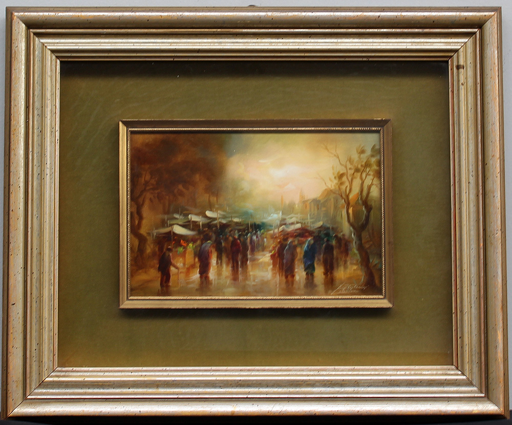Firma indecifrata, "Scena di mercato" olio su masonite (cm 20x30) firmato in basso a destra, in cornice