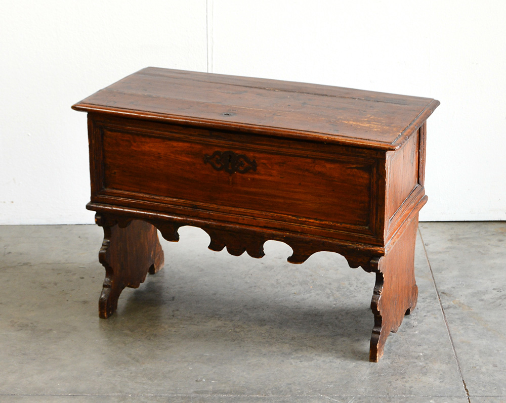Piccola cassapanca con fronte e fianchi riquadrati, gambe e fascia sagomate....