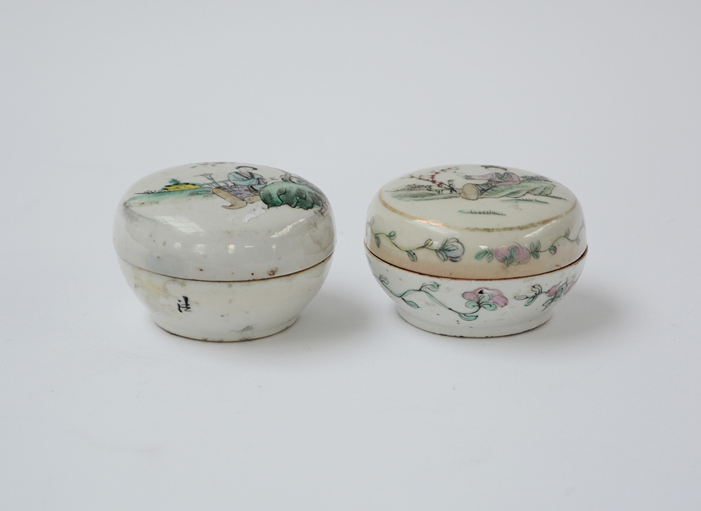Due scatole circolari con corpo in porcellana policroma decorata con dame (h cm 5)