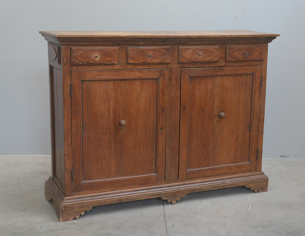 Credenza in noce con due ante riquadrate e quattro cassetti sottopiano pannellati (cm 157x115x46) (difetti)