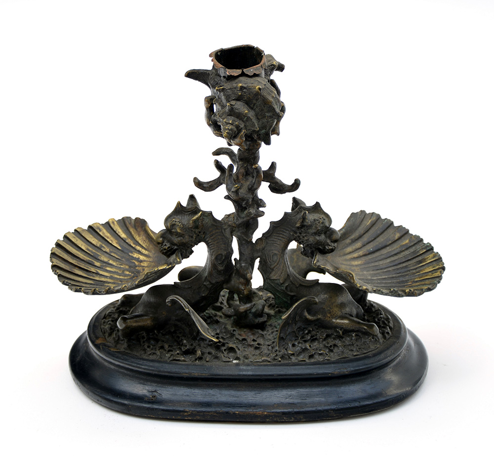 Saliera in bronzo con vasche a forma di valve di conchiglia sorretta a figure fantastiche alate e centrate da ramo con porta candela a forma di conchiglia (h. cm 15) Secolo XIX. Poggiante su base in legno