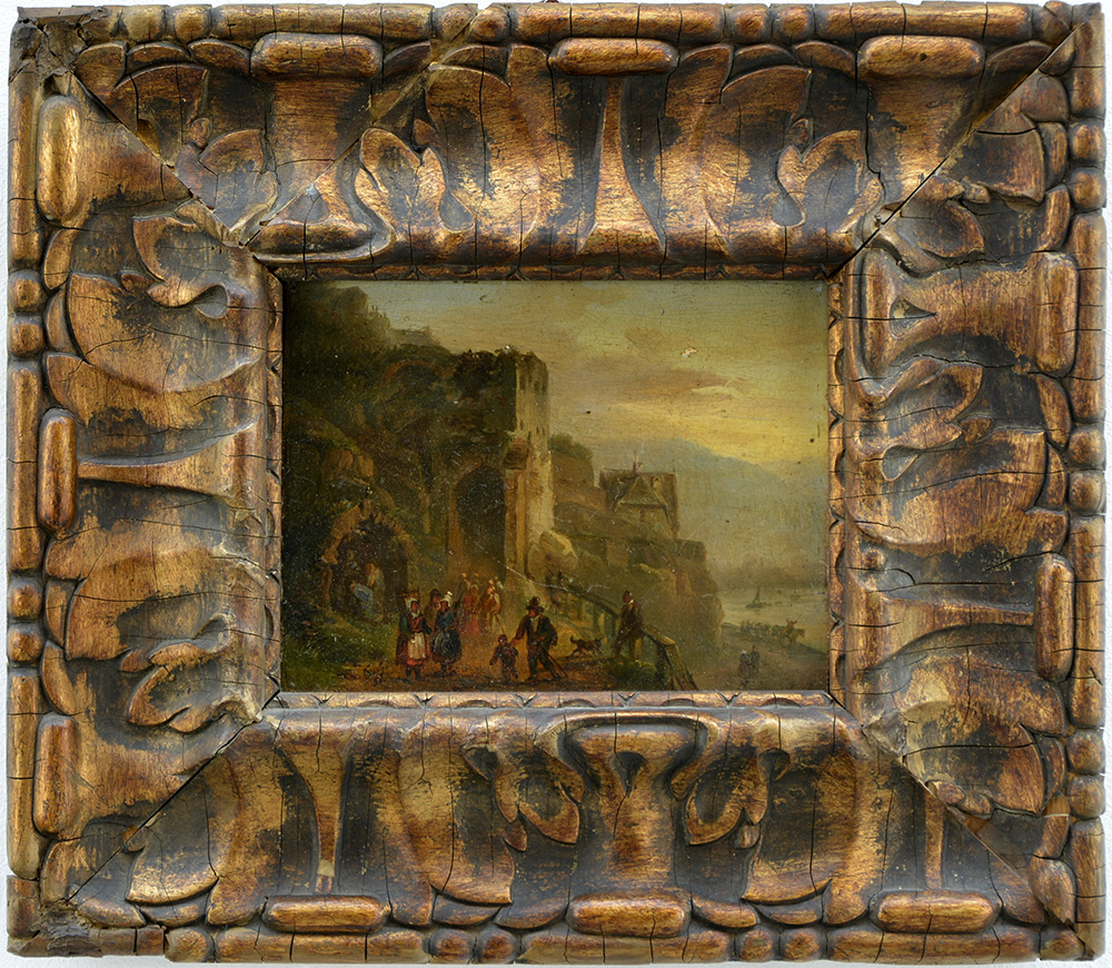 Maestro fiammingo della fine del secolo XVIII-inizi XIX "Paesaggio con figure" olio su tavola (cm 13x18) in cornice