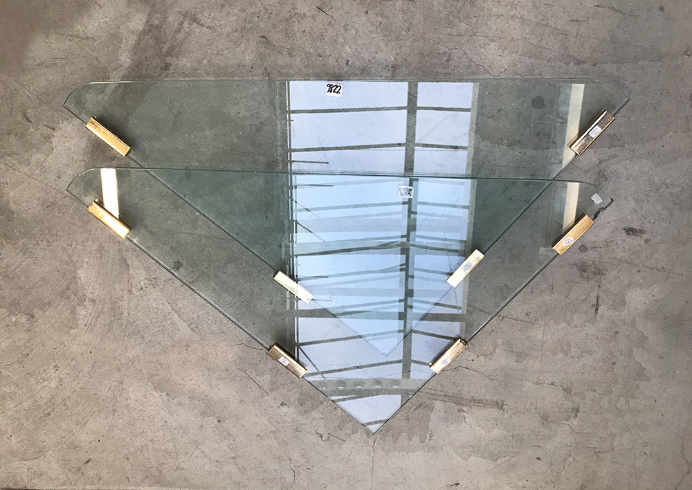 Coppia di mensole ad angolo in cristallo con supporti in ottone dorato (cm 83x64x54) (difetti)